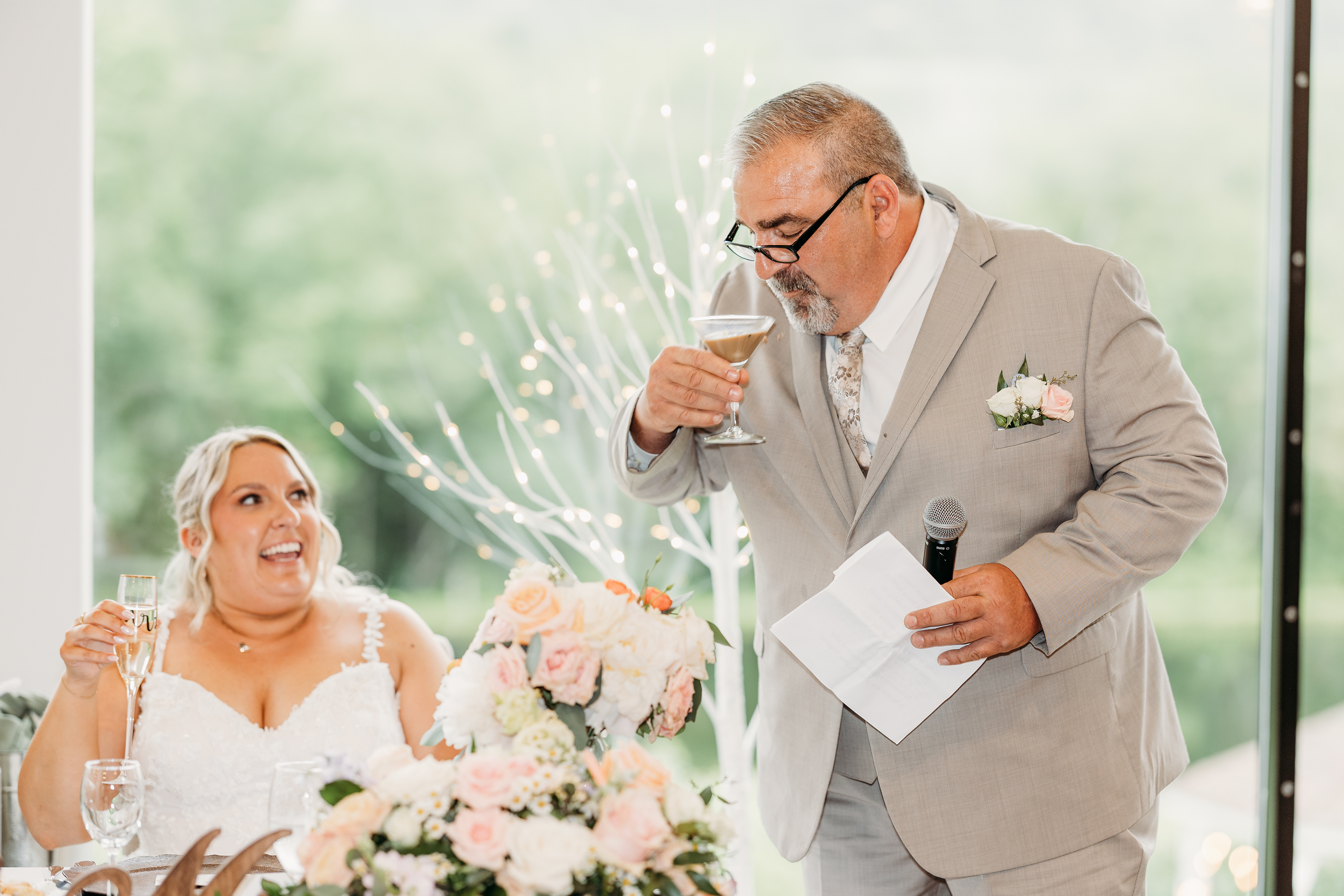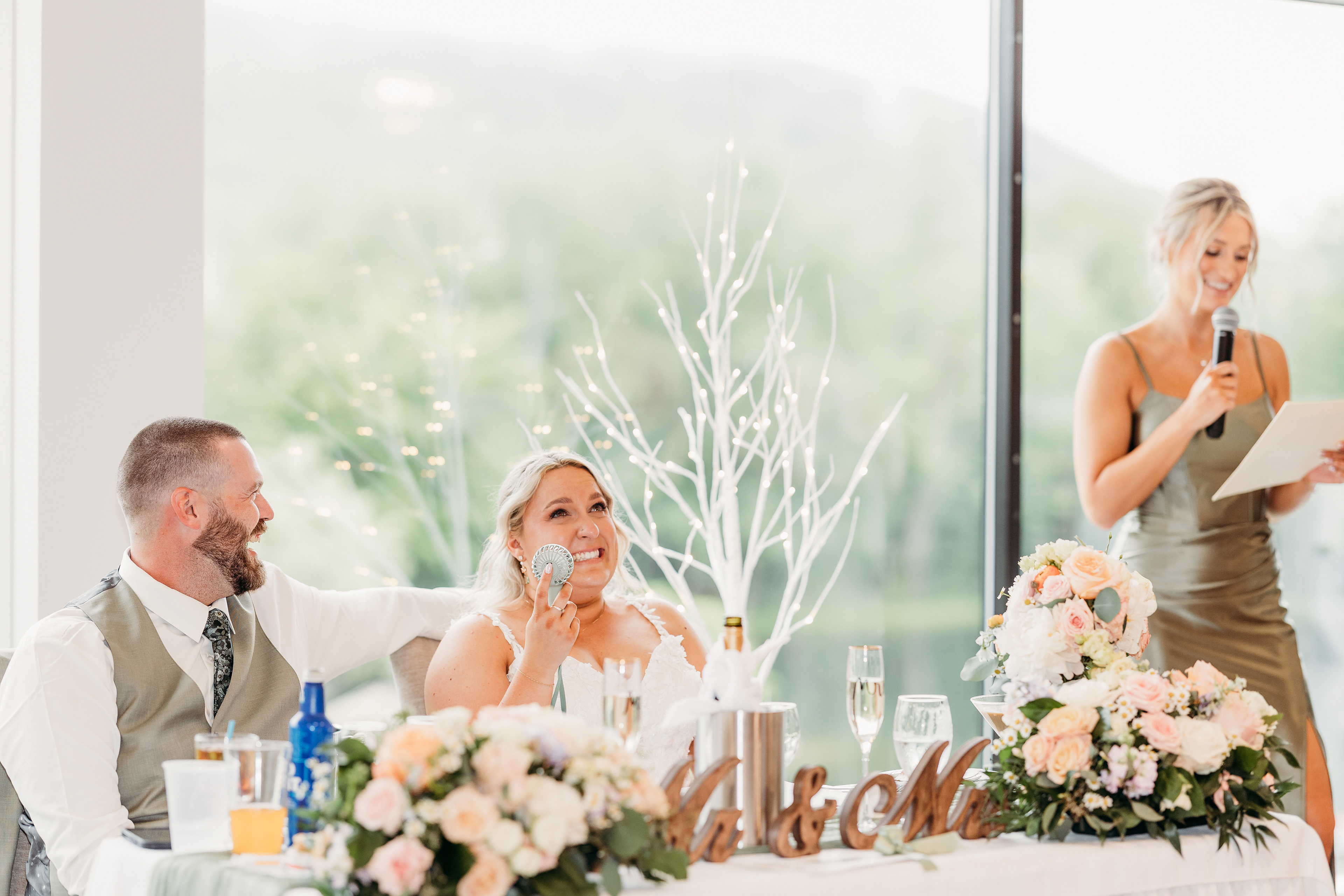 The waterfront ceremony at Indian Head Resort was nothing short of breathtaking. With the White Mountains rising in the background and early summer light shimmering on the water, the couple exchanged heartfelt vows led by Abigail’s godmother and longtime family friend, who traveled all the way from Saint Croix in the U.S. Virgin Islands to officiate.