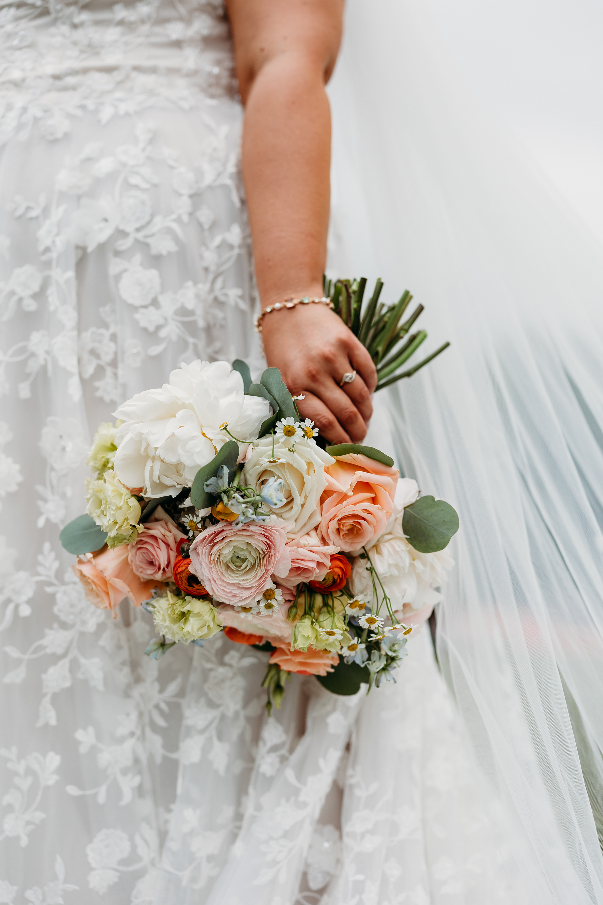 Handcrafted bouquet by FERN Floral — natural textures and soft summer hues for this Indian Head Resort wedding.